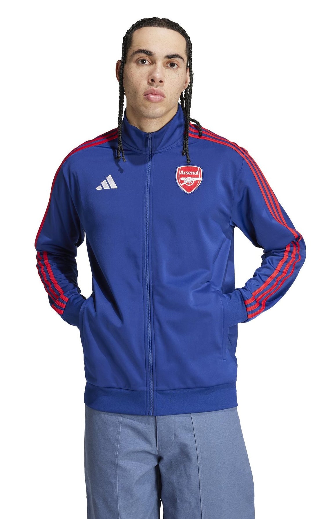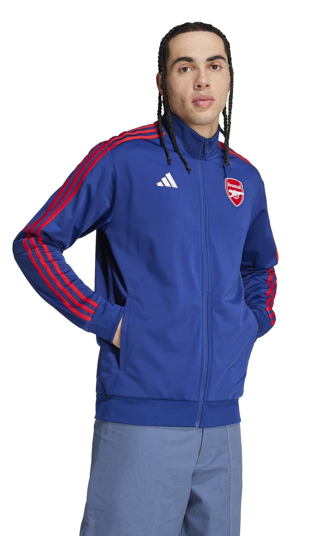 Show your football support in true Gunners style. This adidas track top features classic Arsenal colours and an embroidered badge to proudly display your fandom. Ribbed details and side pockets offer comfort and convenience whether you're cheering from the sidelines or running errands around town. Paired with your favourite jeans or joggers, this top is a casual go-to for any loyal fan.This product is made with 100% recycled materials. By reusing materials that have already been created, we help to reduce waste and our reliance on finite resources and reduce the footprint of the products we make.